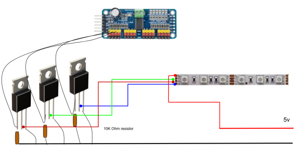 The ESP8266 acts like a web-server and drives the PCA9685 which expands the number of output devices I can control. Each mosfet controls a single color. I have 8 “pucks” that I put on the wreath, each “puck” has 3 colors, which translates into 24 mosfets and … 24 pins on the PCA9685